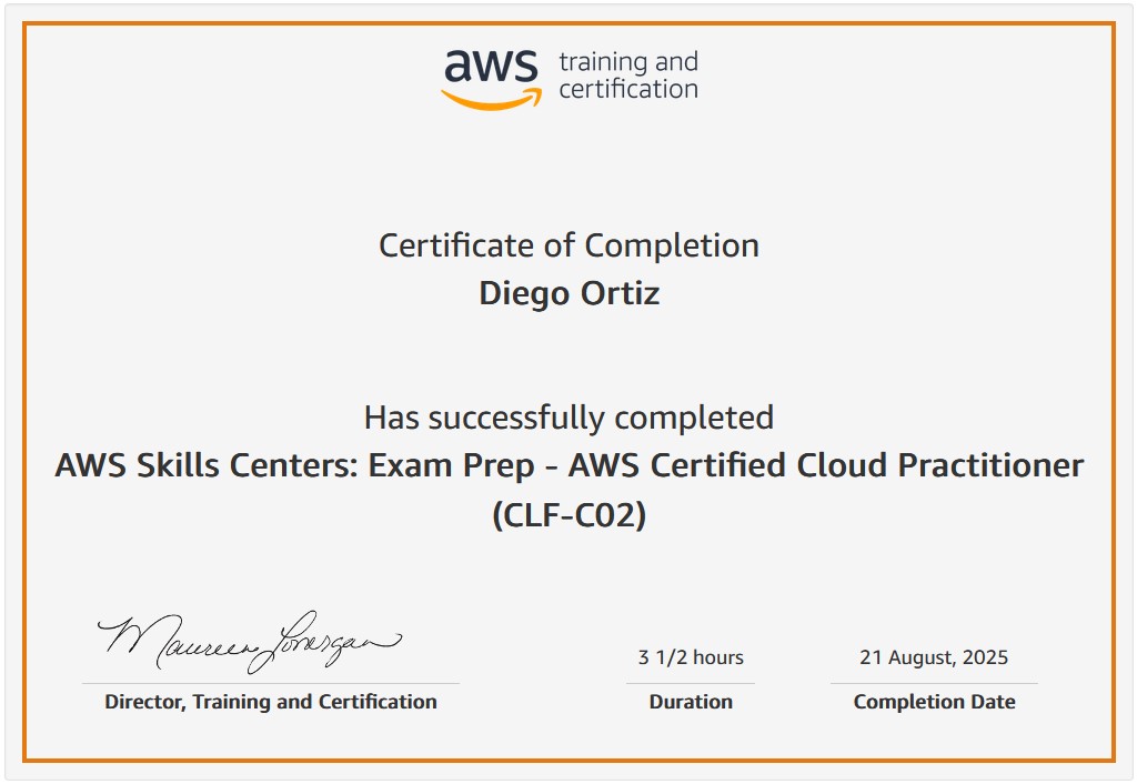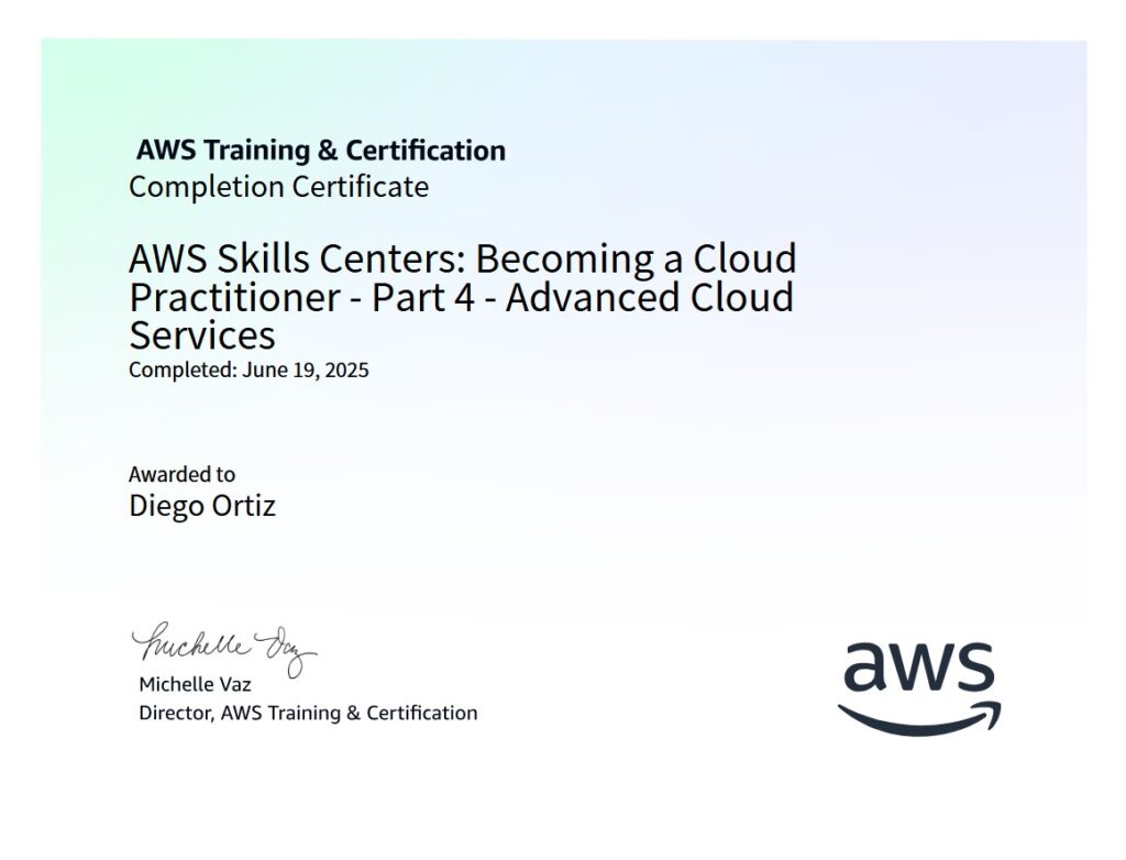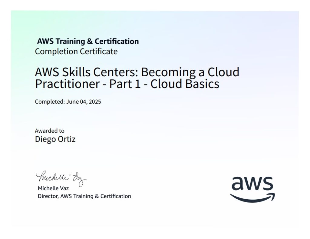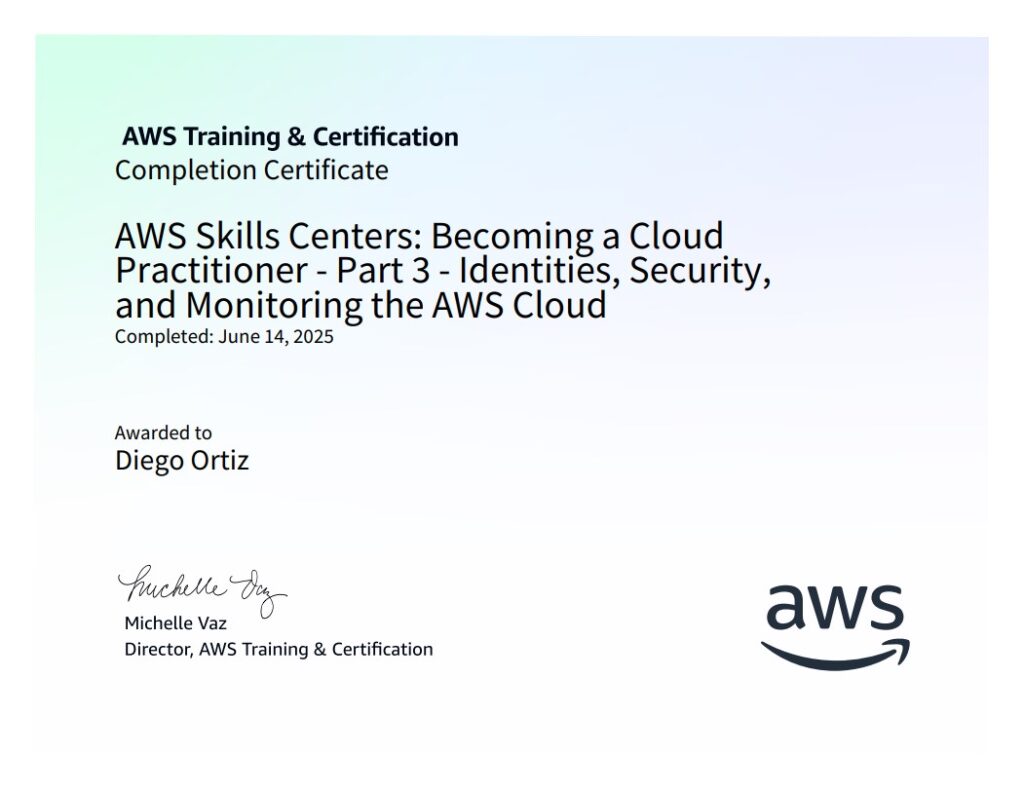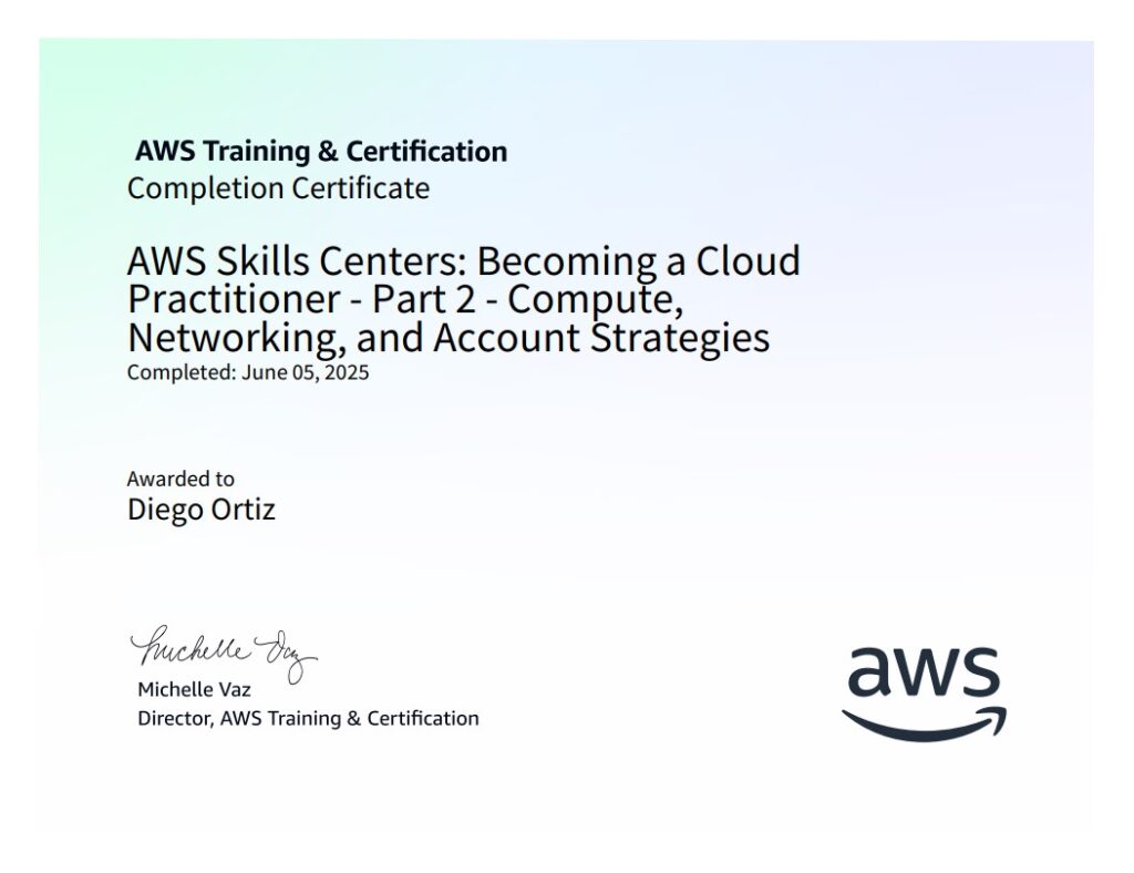 …AWS re/Start Program Graduated, and taking the Certified Cloud Practitioner Exam during November 2025;